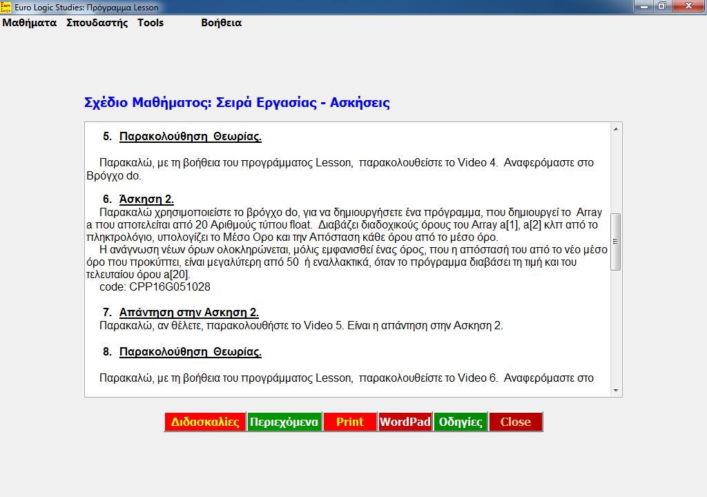 Στη συνέχεια ζητάει από το σπουδαστή να παρακολουθήσει το Video 6, δηλαδή μία επόμενη θεωρία και το Μάθημα προχωράει, με συνεχή εναλλαγή θεωρίας και ασκήσεων.